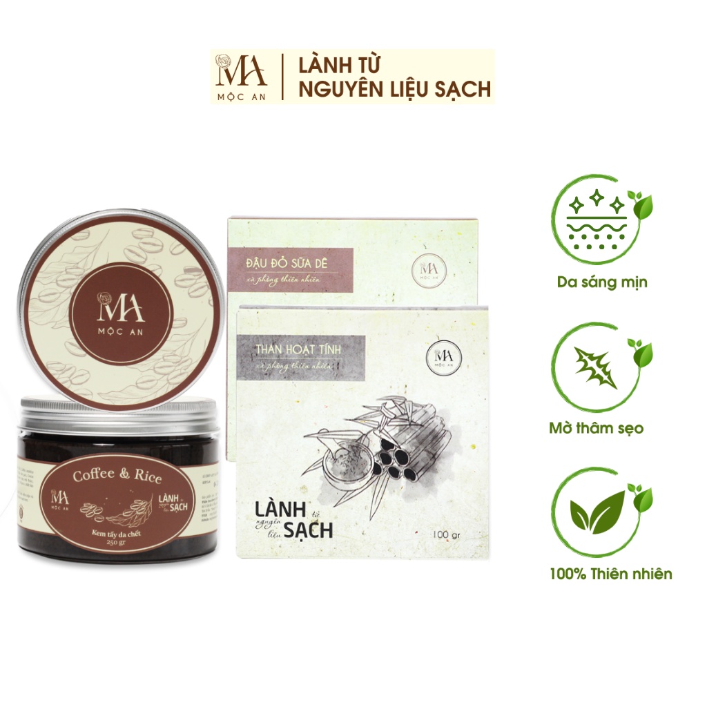Combo sáng da, mờ thâm sẹo Mộc An là cứu cánh cho bạn sở hữu một làn da trắng, mịn màng nhờ bảng thành phần thiên nhiên giàu dưỡng chất bản địa được tuyển chọn kỹ càng như: Cà phê, đậu đỏ, sữa dê, nghệ mật ong, dầu Olive, dầu hướng dương…. Không SLS – Không Silicone – Không Hương liệu. Cho bạn một làn da sáng mịn mơ ước và an toàn cho sức khỏe.