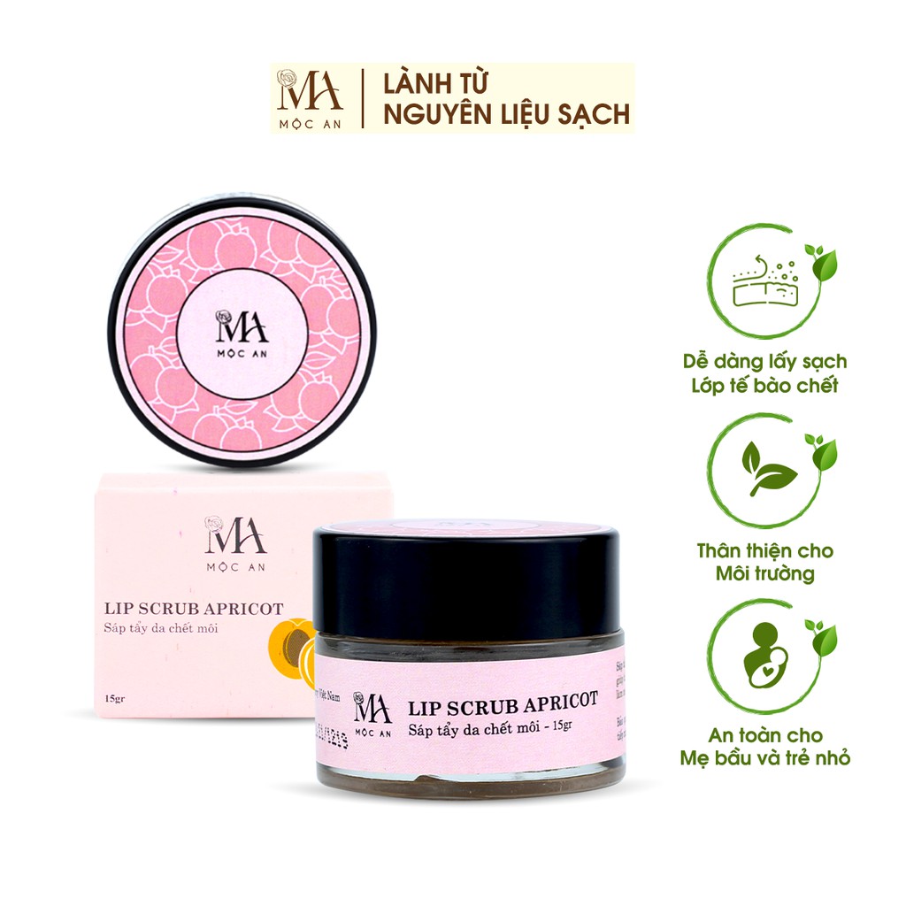 Sáp tẩy da chết môi Mộc An là sản phẩm tẩy da chết vật lý dạng hạt thiên nhiên (Scrub), sử dụng bột vỏ hạt quả mơ và bột vỏ hạt (quả) óc chó xay nhỏ với các cạnh được mài tròn, không gây rát hay tổn thương đến môi, giúp môi trở nên mềm mịn và giúp lên màu đẹp hơn khi tô son. Việc sử dụng các loại hạt thiên nhiên trong TDC môi không chỉ giúp môi được tẩy da chết tốt hơn mà còn thân thiện với môi trường vì các hạt này dễ dàng phân hủy khi thải ra môi trường.